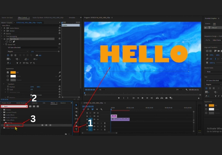 Grab the Text Tool from the toolbar and type out your message on the screen. Once your text is in place, head over to the Essential Graphics panel. From there, you can change the font, size, and style until it looks just right.