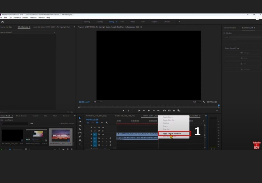 From the menu, click “Apply Default Transitions.” That’s it! Premiere Pro will automatically add a fade-out effect to the end of your audio.