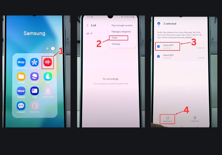 Here’s where Samsung saves your deleted voice recordings, along with files from other apps like “My Files.” It works like a recycle bin; deleted files aren’t immediately gone from the device.