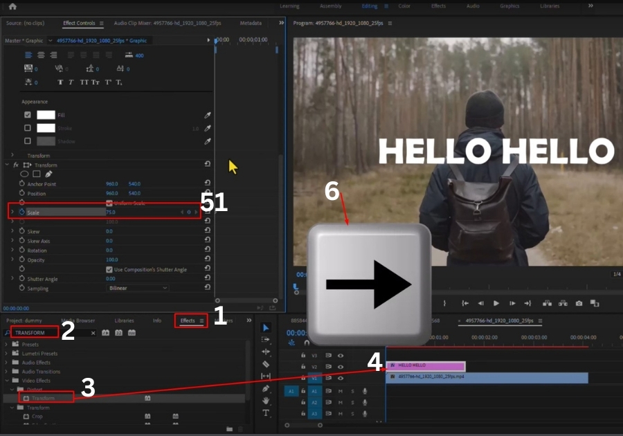 Head over to the Effects panel and type “Transform” in the search bar. Drag the Transform effect onto your text clip.